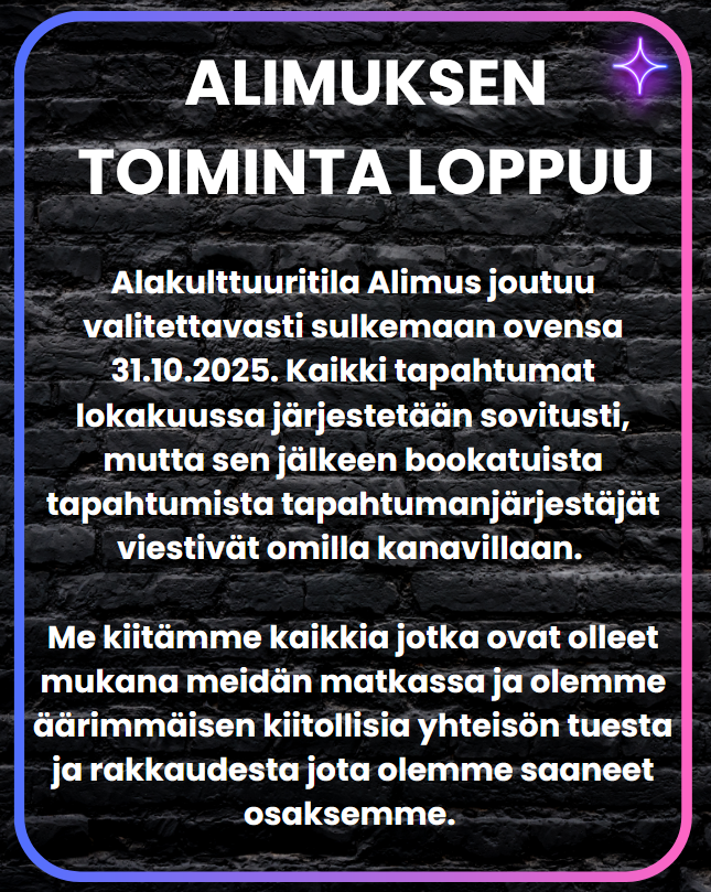 It’s over alakulttuuritila_alimus Alakulttuuritila Alimus on uusi kulttuuri- ja tapahtumatila Kallion sydämessä. Avoinna tapahtumien puitteissa. It was good while it lasted. Thank you to everyon Thanknyou for 3000 followers! #alimuksessatapahtu Tekisikö mieli Nauraa? Alimuksen Elokuu tarjoaa Kaipaatko nauruja kesälle, mutta et tiedä minne Hyvää Juhannusta toivottaa Alimuksen Väki!! Tsekatkaa meidän stooreja ja osallistukaa meidän Tapahtumien määrä Alimuksessa vähenee kesäkuu On aika valmistautua ensiviikon tapahtumiin Alimuk Kai kaikki on matkalla nauttimaan tämän viikon o Tämän viikon ohjelma suunnitelma! #party #part Alimuksen toukokuu on täynnä kiinnostavia tapaht Alimuksella on huikea viikko luvassa! Oman toimi Pääsiäinen tulee ja mekin menemme omaan rauhaan Viikolla 15 Alimuksella jatkuu Teatteriviikot! # Muistakaa äänestää kuntavaaleissa! #alimus #a Tällä viikolla Alimuksella poikkeuksellisesti ke Alimuksessa tapahtuu taas jälleen kerran! Viikko Tällä viikolla Alimuksella stand uppia, musaa ja Vastaa kävijäkyselyyn ja auta meitä kehittämä Lataa lisää Seuraa meitä Instassa!