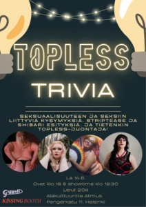 Luvassa stripteasea, shibaria ja tietovisaa seksistä ja seksuaalisuudesta! Voittajille luvassa tietenkin palkintoja.